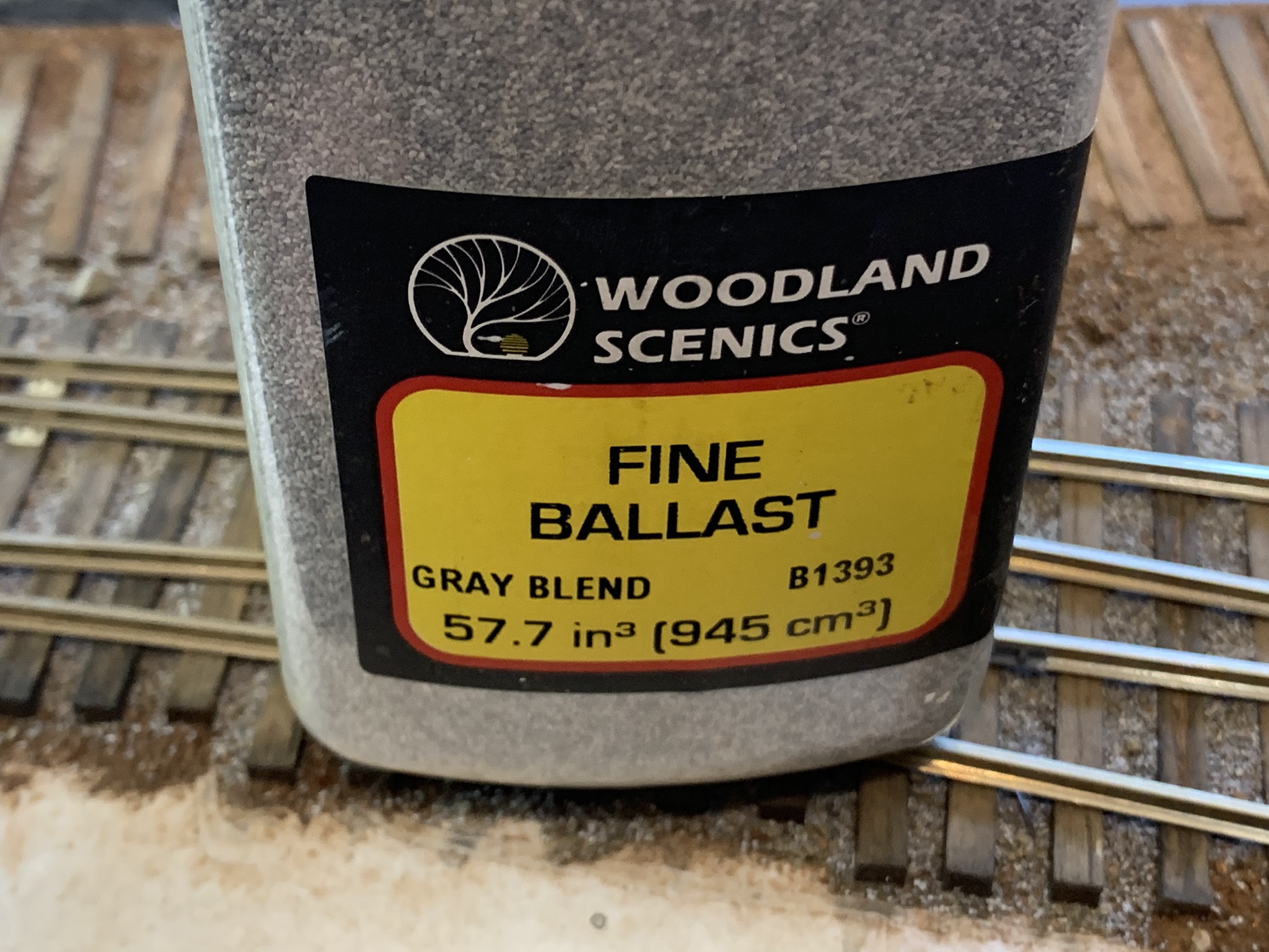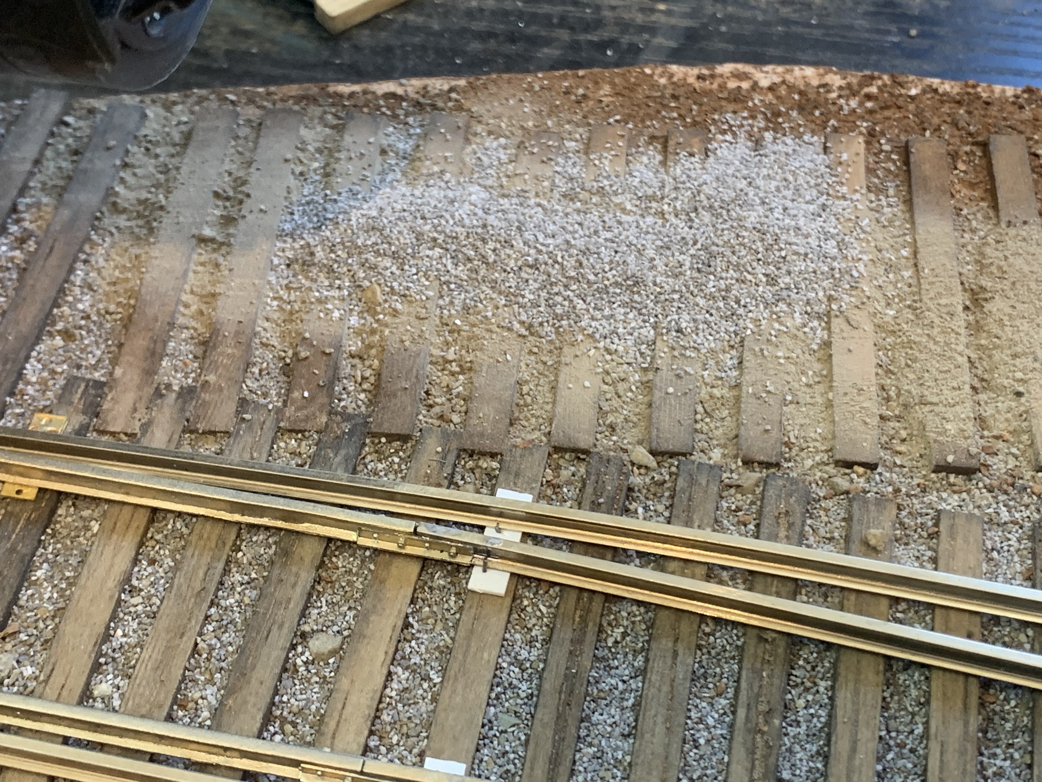 Pore the gravel onto the ties and using a large, two-inch brush work it into the ties. Larger rocks can be removed if desired. Then use commercial ballast, in this case Woodland Scenics Fine Ballast gray blend.