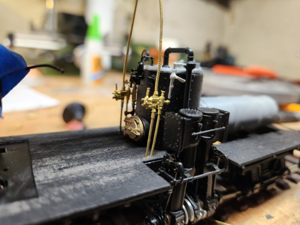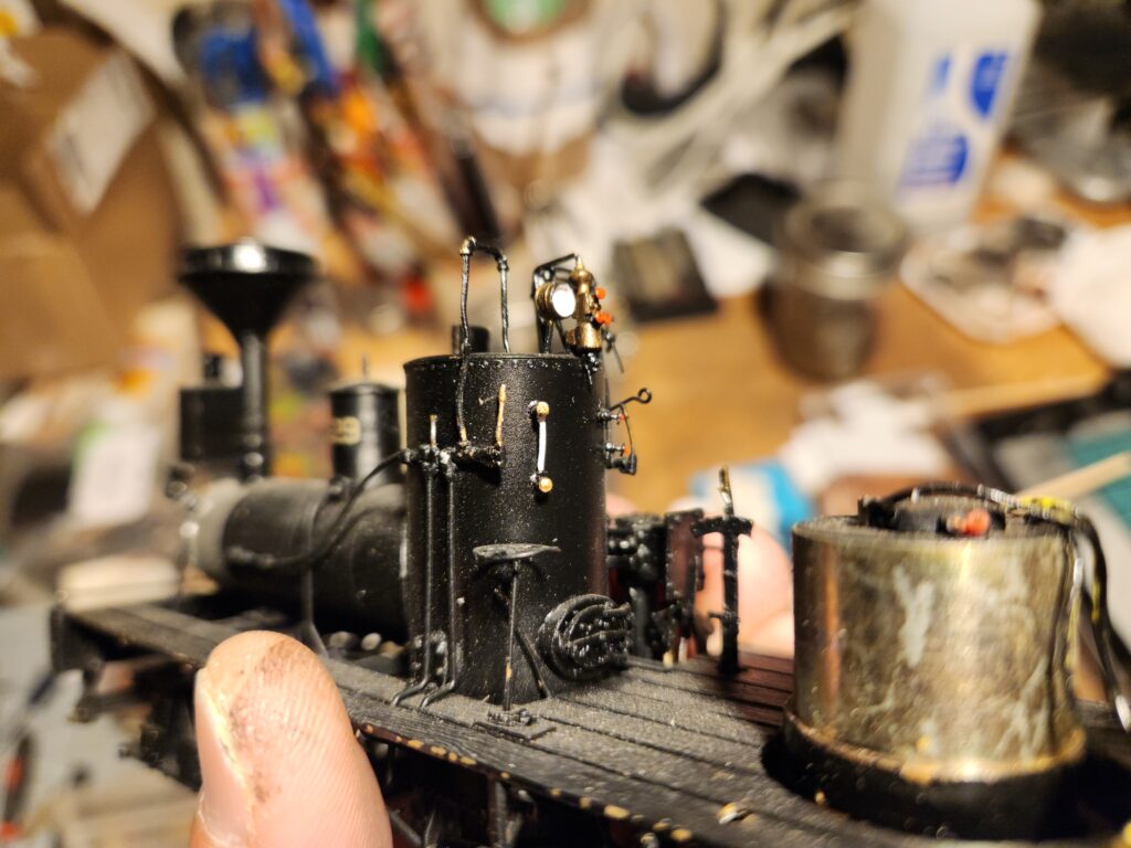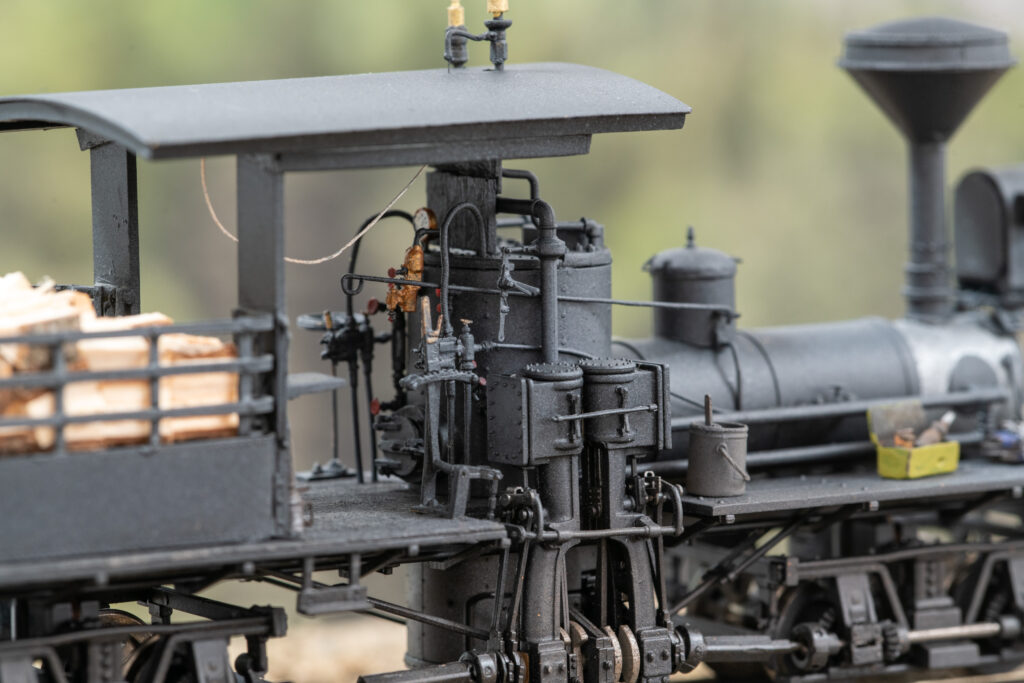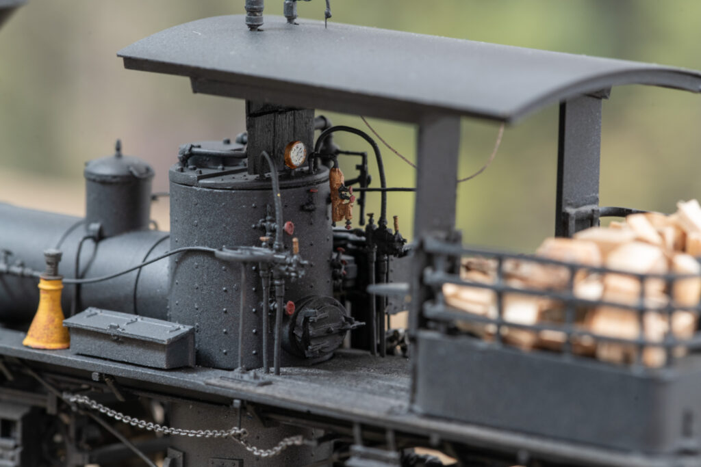 With the superstructure sorted, I spent a significant amount of time planning and placing the backhead details and piping the injectors, pop valve and whistle. All these details came from Kieth Wiseman, PSC, off the Bachmann model, or were scratch built. The reverse lever was a fun detail to build and add onto the engineer’s side. It is a function of the real locomotive that I needed to study to learn how it would have looked and operated in real life. With everything being so open and exposed it all needs to be realistic, and I did my best to build it as such.