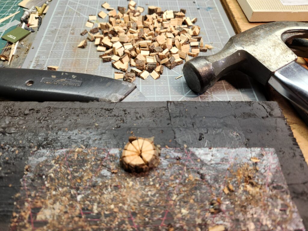 I feel like the wood pile is often overlooked and using real wood is head and shoulders better than a plastic casting. I’ve had a journey to my current method, where the first pieces I cut were almost as laborious as splitting real pine. Now, I am using a powered mini chop saw to cut the pieces to length. And then I put a strip of double-sided duct tape onto a scrap 1×4” piece of lumber. Each “round” is stuck down, and I use a metal box cutter and claw hammer to “chop” out wood pieces. The double-sided tape keeps everything from spilling all over and allows each round to be cut eight or ten times without needing to be reset or put on end again. In just 10 minutes I can have enough wood for multiple piles.