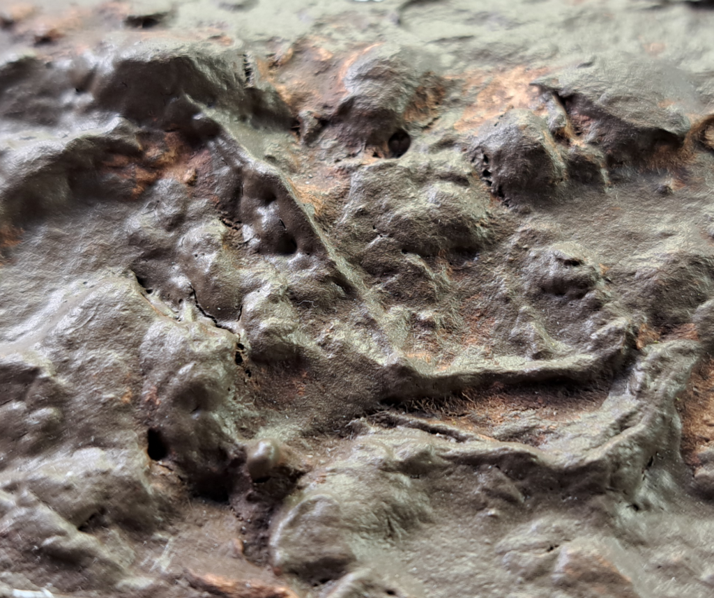 I had a small area of ground next to the track that needed to be elevated. After sculpting some foam to form a berm and gluing it in place, I mixed up some Sculptamold and applied it rather haphazardly over the foam. The best way to describe the finished surface is “lumpy.” After it dried, I painted it a dark brown color and then applied a mixture of static grass.